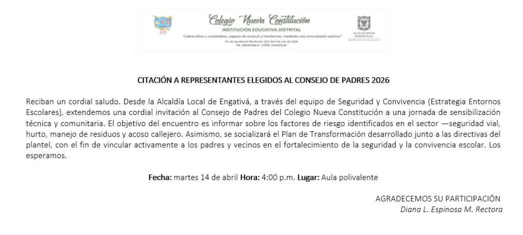 CNCCNC 2 CITACIÓN CONSEJO DE PADRES 2026 PREICFES GRATUITO PARA ESTUDIANTES DE GRADO 11 2026Empieza el 11 de Abril LINK DEL FORMULARIO PREICFES GRATUITO 2026 INAUGURACIÓN DE JUEGOS INTERCURSOS 2026 JORNADA ESCOLAR JUEVES 12 DE MARZO ESCUELAS DE PADRES 2026 - 1 Información importante para los Estudiantes de Grado Décimo CIRCULAR INICIO DE AÑO 2026 Circular Inicio año 2026 PRUEBA DE ESTADO SABER 11- 2026